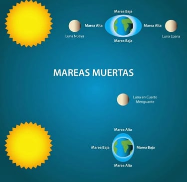 Mareas muertas (o de cuadratura): son las que se producen cuando el sol y la luna están formando un ángulo recto entre sí. Esta posición de los astros corresponde a la fase lunar de cuarto creciente o cuarto menguante (media luna en el cielo).